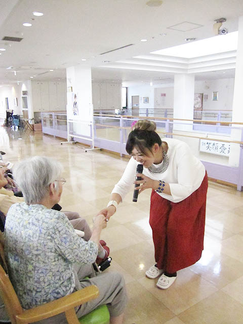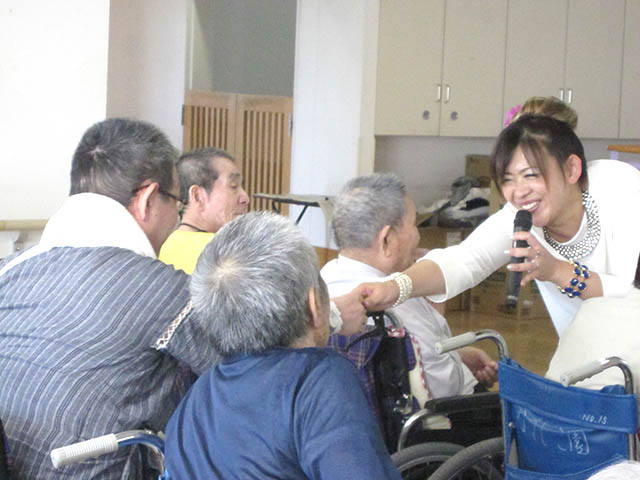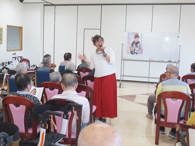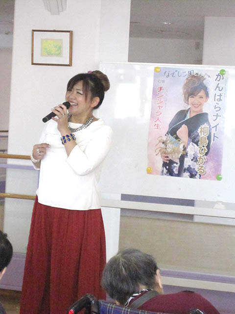歌手の桐島ひかるさんが来園しました。 10月1日(月)に隣町の川南町出身の歌手・桐島ひかるさんにお越しいただき、新曲の「がんばらナイト」をはじめ、ご利用者様に馴染みのある昔の曲を歌っていただき、皆さん大変楽しまれました。 桐島さん ありがとうございました。